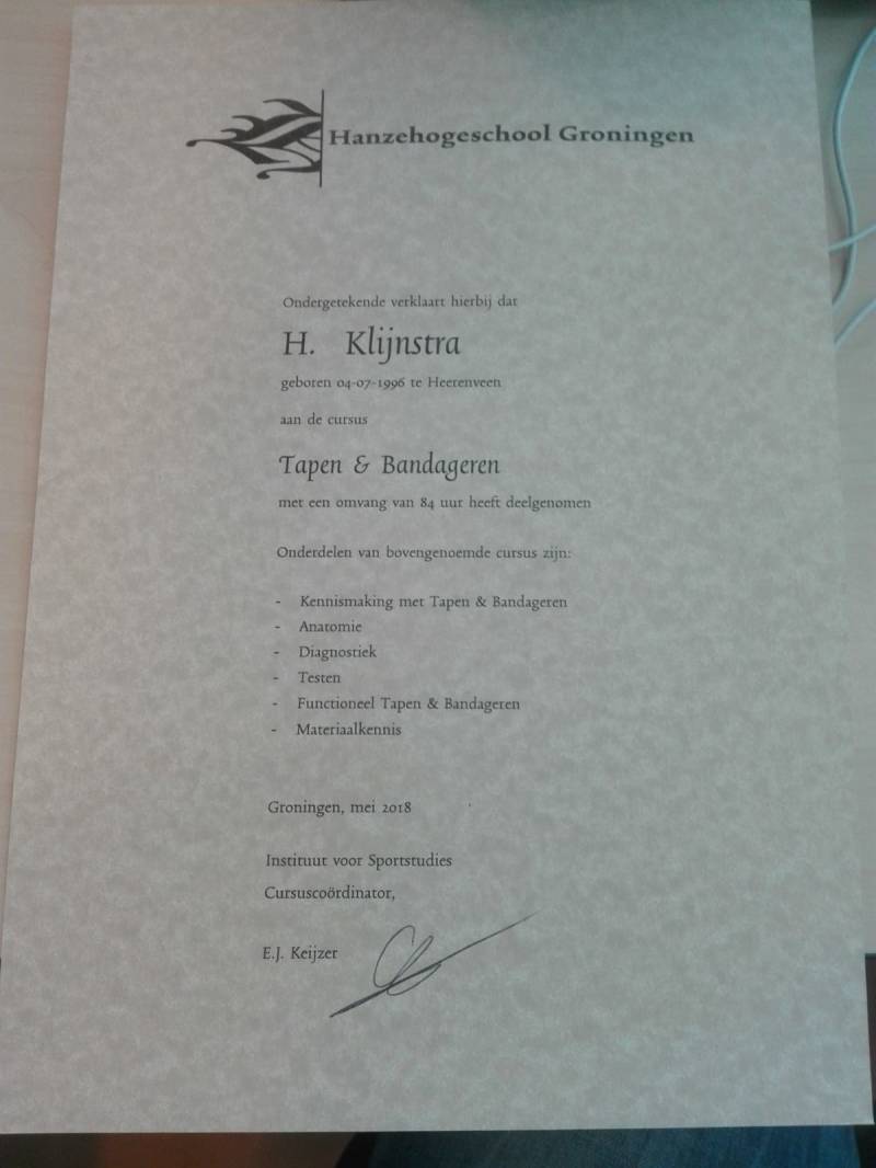 Als tweede keuze heb ik gekozen voor tapen en bandageren. Op het moment ben ik werkzaam in de fitnessbranche en heb ik bovenstaand ook een cursus gekozen die aansluit bij mijn werk. Echter heb ik in de toekomst plannen om de studie fysiotherapie te gaan doen. Naast de plannen van fysiotherapie heb ik een aanbod van personal-training binnen de motorcross lopen. Als ik mezelf kan verbreden met beide cursussen kan ik zowel mijn cv verbreden als tapen en bandageren waar nodig. Voor deze cursus staan 3 EC's. In blok 2.3 is de cursus tapen en bandageren gevolgd. Deze cursus is behaald met een voldoende en kan erg mooi ingezet worden in het werkveld.